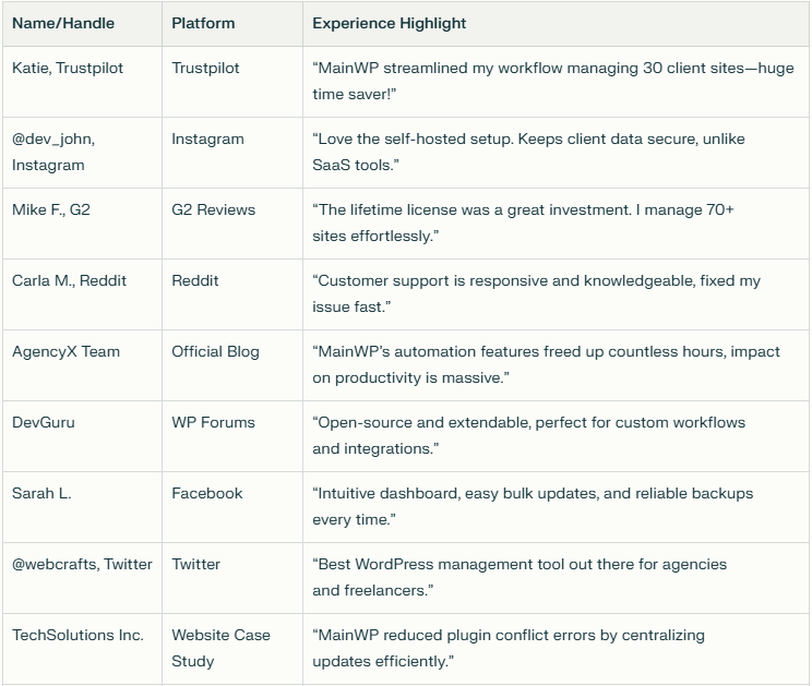 MainWP enjoys widespread acclaim with thousands of agency professionals, freelancers, and enterprise users globally relying on its platform daily. Verified testimonials underline its value: