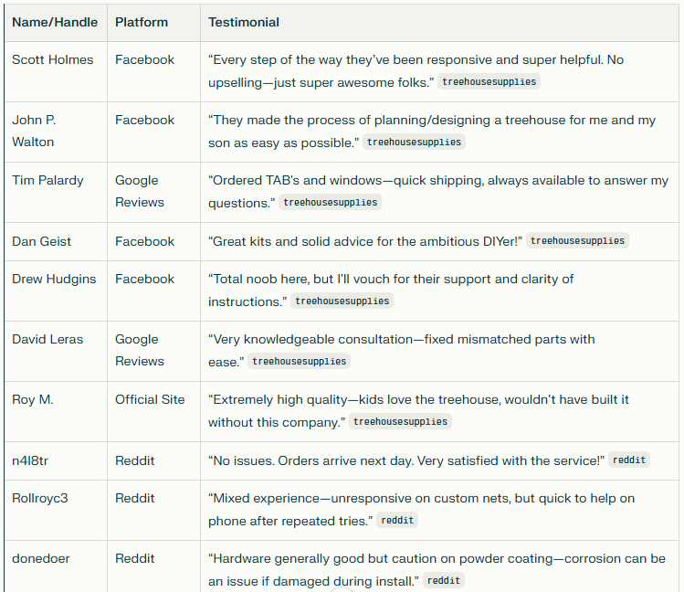 Authentic voices across social media, review sites, and forums relay the tangible benefits and experiences Treehouse Supplies delivers for everyday users: